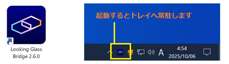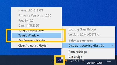 | Looking Glass Bridge | PCからLokking Glassを利用するのに必要なソフトウエアです Looking Glass Bridge公式サイト Windows Downloadからインストーラーをダウンロード、導入してください ※ PCモニターで利用する場合は不要です |