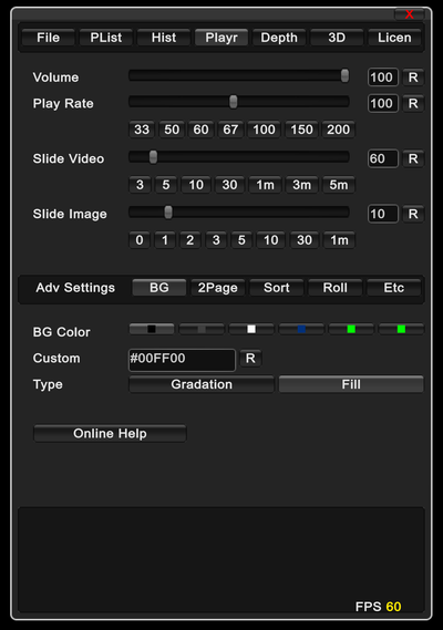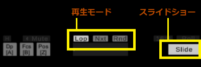 | Slide | スライドショー | I または P | 動画の場合は動画内のランダムな位置を指定時間再生します 画像の場合は指定時間表示して次の画像を表示します 画像の場合はPキーでも ON / OFFできます |