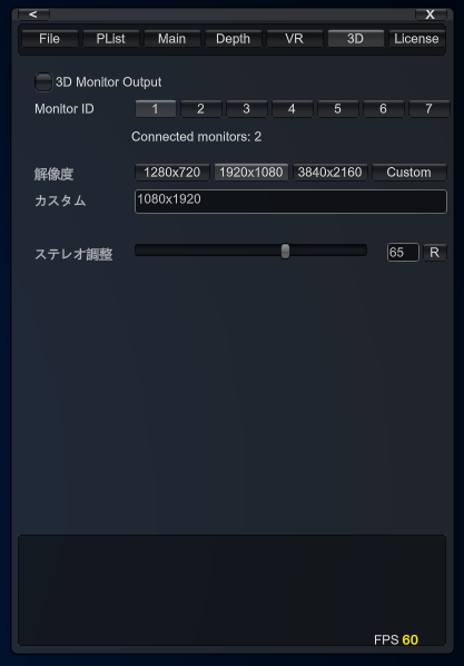 ※ 「3D Monitor Output」を一度ONにするとメインモニターへ最大化されます。ウインドウモードで利用することはできません。