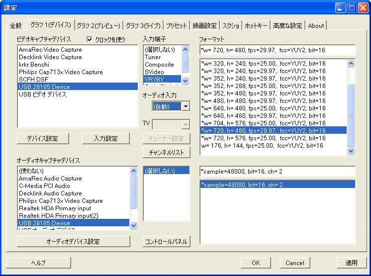 fps=59.94, fcc=YUY2, bit=16」を選択します。自動的にダブラーが働き録画やスクリーンショットは720x480、59.94fpsで処理されます。